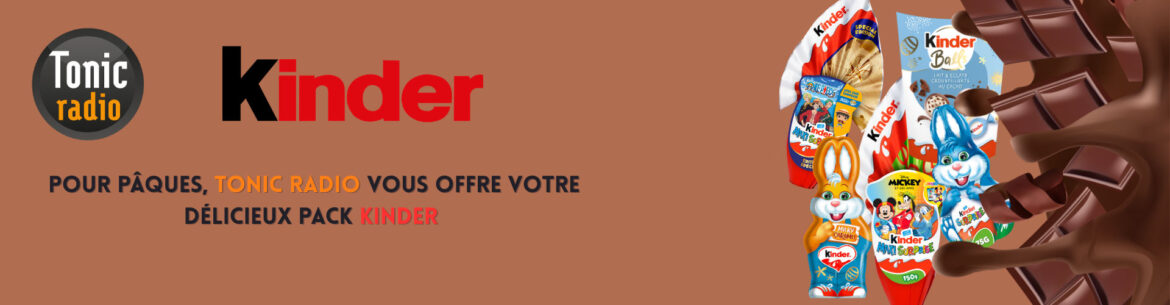Tonic Radio vous offre votre pack Kinder ! (Photo non contractuelle - les références Maxi Kinder Surprise à gagner peuvent changer selon les disponibilités). Pour participer, remplissez le formulaire suivant. Rendez-vous dans Tonic Matin (06h - 10h) et Tonic Plus (16h - 20h) pour le tirage au sort.