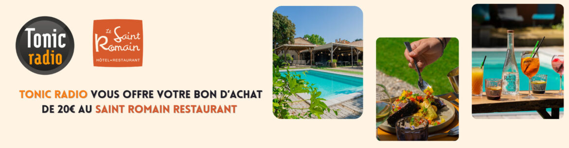 Tonic Radio vous offre votre bon d'achat de 20€ au Saint Romain restaurant ! (Photo non contractuelle - les références Maxi Kinder Surprise à gagner peuvent changer selon les disponibilités). Pour participer, remplissez le formulaire suivant. Rendez-vous dans Tonic Matin (06h - 10h) et Tonic Plus (16h - 20h) pour le tirage au sort.