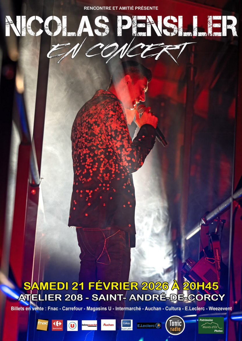 Un concert événement : Au-delà du temps — En concertAvec Au-delà du temps — En concert, Nicolas Pensller invite le public à plonger dans son univers artistique singulier. Plus qu’un simple concert, il s’agit d’un véritable show immersif où la musique dialogue avec l’image et la mise en scène.Les spectateurs auront le privilège de découvrir en exclusivité les titres du nouvel album Au-delà du temps avant sa sortie officielle. Les morceaux marquants de l’EP Introspection viendront également rythmer la soirée, pour le plus grand plaisir des fans de la première heure… et de ceux qui le deviendront.Un voyage visuel et sonorePensé comme une expérience complète, le spectacle promet :Des effets vidéo et des décors immersifs. Des jeux de lumières spectaculaires. Une mise en scène forte et poétiqueChaque détail a été conçu pour transporter le public dans un univers à la fois pop, électro-pop et variété française, aux sonorités modernes et cinématographiques. Pendant environ 1h30, chaque chanson devient un moment suspendu, mêlant énergie et émotion.Un rendez-vous pour tous les publicsAccessible à tous, ce concert se veut fédérateur. Que vous soyez déjà fan de Nicolas Pensller ou simplement curieux de découvrir un nouvel artiste sur scène, cette soirée s’annonce comme une expérience musicale inoubliable. Rendez-vous le 21 février à 20h45 à L’Atelier 208 à Saint-André-de-Corcy pour vivre Au-delà du temps